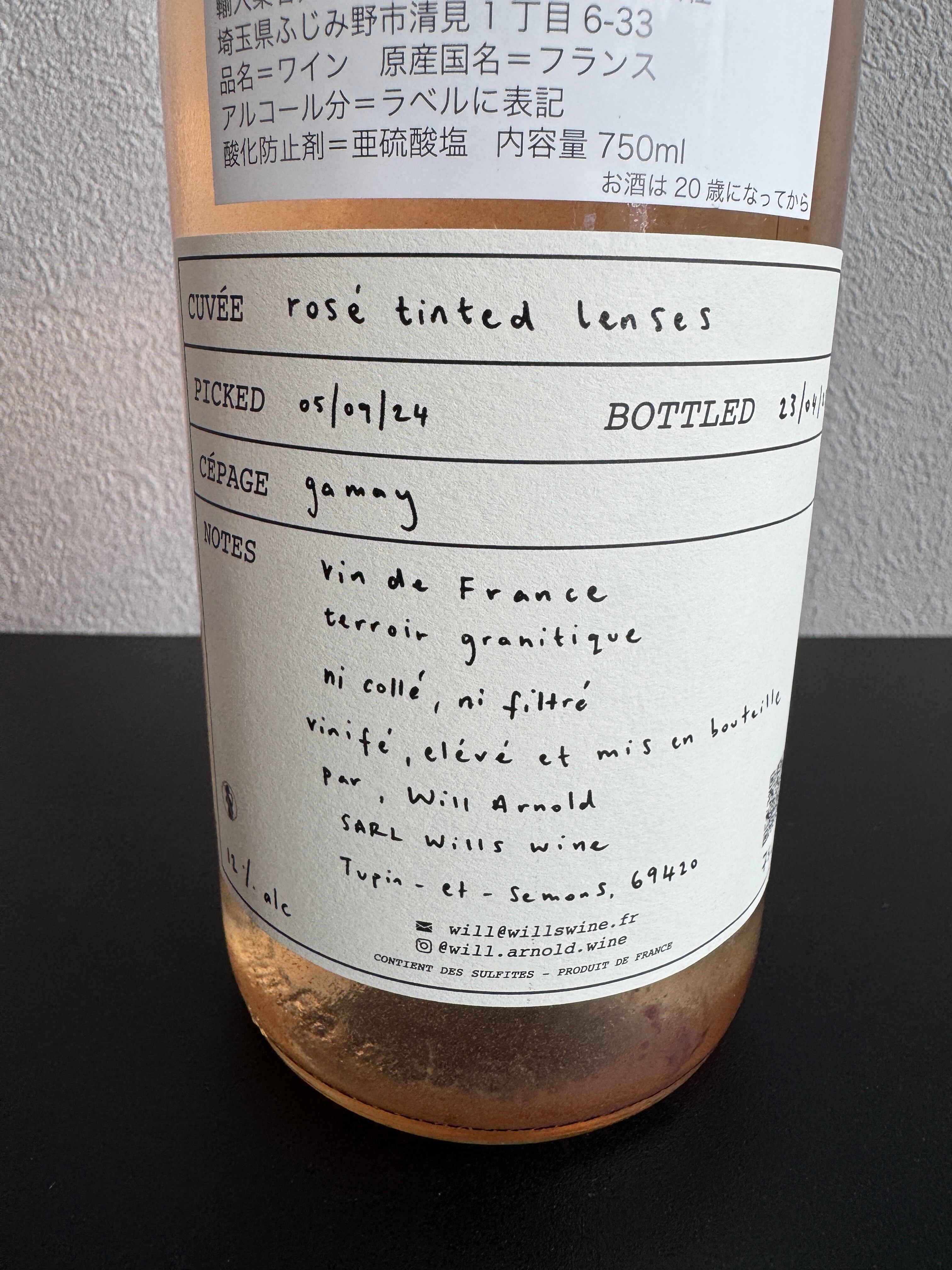 Pink-tinted glasses(バラ色の眼鏡)という英語の表現がある。物事の現実をそのまま見るのではなく、少し楽観的に、あるいは世界が少しだけ明るく見える状態を指す言葉だ。このキュヴェrosé tinted lenses は、まさにその言葉遊びから生まれたようなロゼである。グラスの中には、花崗岩土壌のガメイらしい軽やかな果実味と、桃や赤いベリーを思わせる柔らかなアロマ。全房プレスによる繊細な抽出と、古樽とファイバーグラスタンクでの熟成が、透明感のあるテクスチャーを形づくっている。飲み口は軽やかでフレッシュ。それでいて、ほんのりとした塩味と果実のジューシーさが心地よく広がる。気づけば、グラスの向こう側の景色が少しだけ柔らかく、明るく見えてくる。まるで “rosé-tinted lenses” を通して世界を眺めているかのように。
