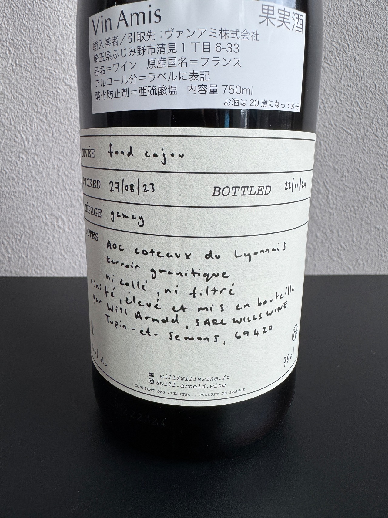 北向き斜面に植えられた樹齢25-60年のガメイは、晩夏の熱を受けて十分な熟度を得ながらも、花崗岩由来の引き締まったミネラルを備えている。ワインは深みを備えながらも、口当たりは明るく持ち上がるような印象。ガメイでありながらやや南方的なニュアンスを帯び、時にシラーを思わせるようなスパイスや黒系果実の表情を見せる。ブラックベリーやタルトチェリー、タイムやグリーンペッパーコーン、岩を思わせるミネラルが重なり合い、複雑で奥行きのある味わいへと続く。若いうちからジューシーな果実味と飲み心地を楽しめる一方で、しっかりとした骨格も備えており、時間とともに表情を深めていくポテンシャルも感じさせる。